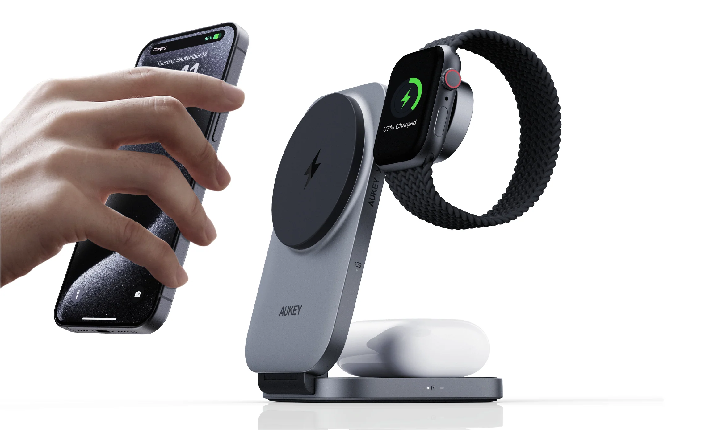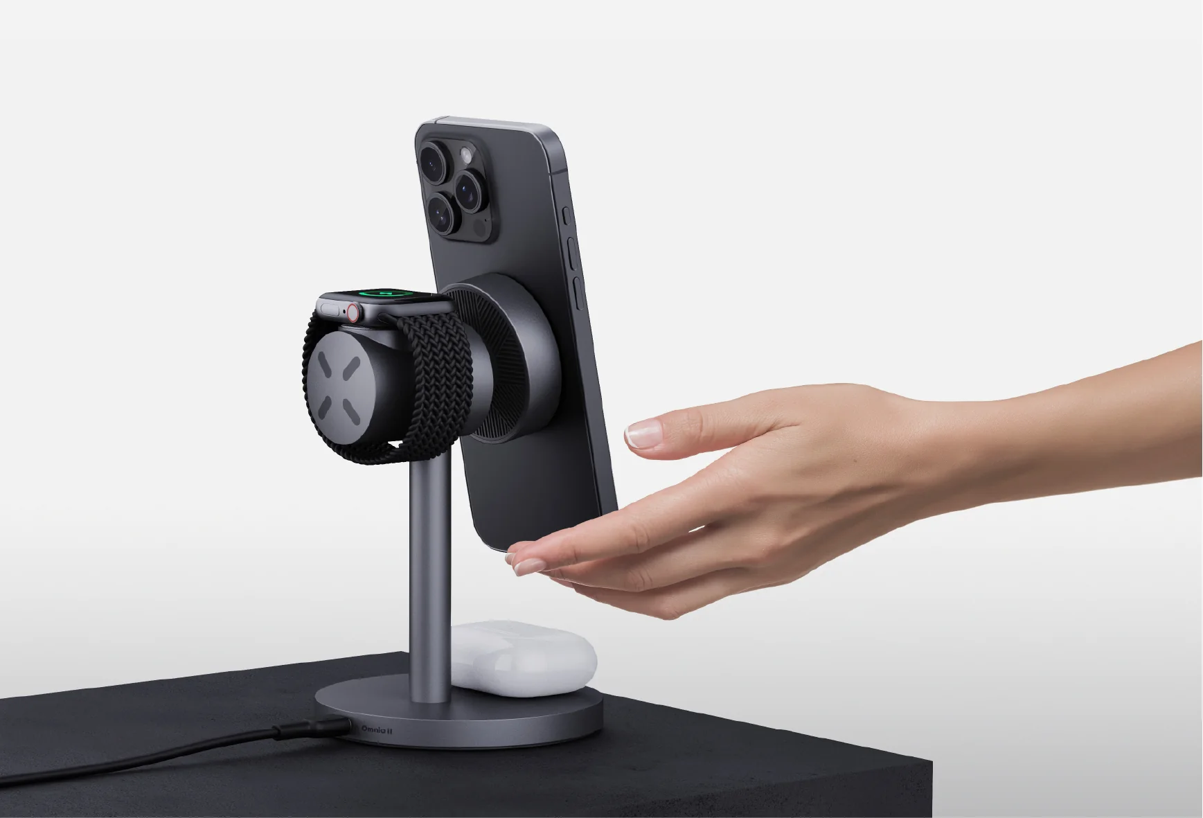 The MagFusion 3-in-1 combines wireless charging and holding features, powered by Omnia-Blitz tech. Ideal for iPhones, AirPods, and Apple Watches, it declutters cables with 15W Qi2 and Apple MFW-certified charging. Adjustable angles offer ergonomic comfort. Crafted from aviation aluminum with glass panels and a minimalist design, it blends functionality and elegance seamlessly.